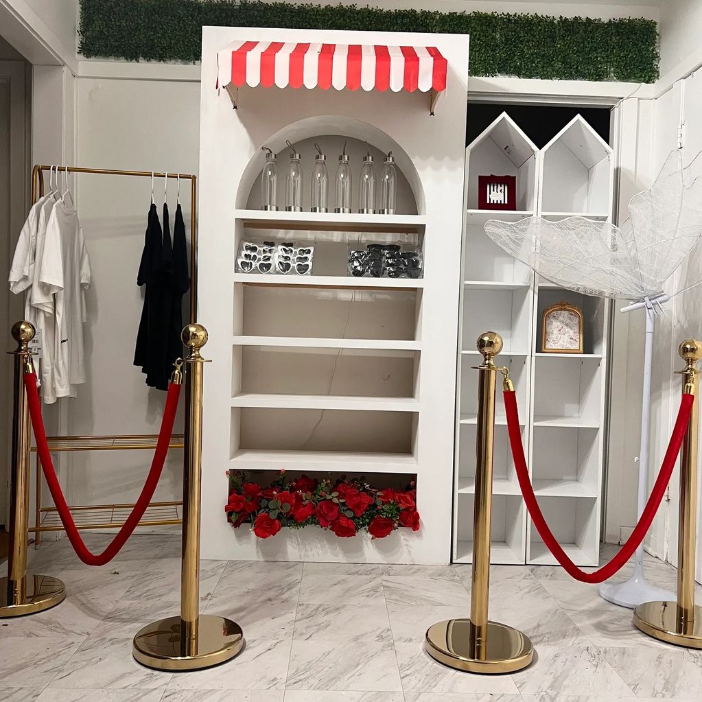 Our Merch shop storefront-style canopy can be customized to suit your preferences that includes our floral arrangement and our stanchion VIP rope.